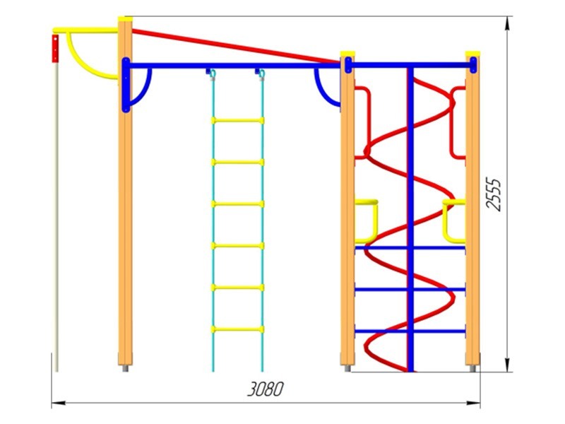 Гимнастический комплекс представляет собой сборноразборную, модульную конструкцию, состоящую из восьми опорных столбов, гимнастических брусьев, трубы для спуска, трубы для спуска «Спираль», наклонного рукохода, двух усиленных турников, распорных турников, уличного каната, стремянки, гимнастических колец и ручек-держателей. На вершины столбов устанавливаются пластиковые заглушки. Оборудование устанавливается и бетонируется на оцинкованные металлические подпятники. Возраст пользователя от 6 до 14 лет. Опорные столбы выполнены из клееного бруса сечением не менее 100*100 мм. с канавкой посередине. Металлические подпятники, крепление каната, труба для спуска «Спираль», труба для спуска, турник под стремянку и гимнастические брусья выполнены из круглой трубы сечением не менее 42 мм. и листового металла толщиной не менее 4 мм. Наклонный рукоход, усиленные турники и турник под гимнастические кольца выполнены из круглой трубы сечением не менее 34 мм. и листового металла толщиной не менее 4 мм. Распорные турники и ручки-держатели выполнены из круглой трубы сечением не менее 27 мм. и листового металла толщиной не менее 4 мм. Гимнастические кольца выполнены из влагостойкой фанеры толщиной не менее 24 мм. и полипропиленового каната с металлическим сердечником сечением не менее 16 мм. Уличный канат выполнен из полипропиленового каната сечением не менее 40 мм., круглой трубы сечением  не менее 42 мм., равнополочного уголка сечением не менее 25*25 мм. Стремянка выполнена из полипропиленового каната с металлическим сердечником сечением не менее 16 мм., равнополочного уголка сечением не менее 25*25 мм., штампованных пластиковых ступеней. Все металлические и фанерные элементы выполнены с применением высокоточного оборудования. Деревянные элементы изготавливаются на полуавтоматизированной линии по обработке деревянных изделий. Все деревянные элементы изготавливаются из хвойной доски влажностью 7-10%, подвергаемой склейке по длине и ширине заготовки с применением клеев зарубежных производителей; изгибы, радиусы и скругленные кромки тщательно отшлифованы и обработаны краской для закрытия торцов JRM (ГОСТ Р 52169-2012 п.4.3.11). Все деревянные элементы проходят окраску в три слоя: первый слой – грунтование заготовки с последующим шлифованием поверхности, второй слой – покраска вододисперсионной краской с последующим шлифованием поверхности, третий слой – финишная покраска. Все деревянные элементы окрашиваются краской финского производителя TEKNOS, соответствующей требованиям санитарных норм и экологической безопасности. Все металлические элементы изготавливаются из круглых труб, с применением горячекатаного листа. Весь применяемый металлопрокат соответствует ГОСТ 8509-93, ГОСТ 10705-80, ГОСТ 1577-93. Сварные швы конструкций из металла гладкие (ГОСТ Р 52169-2012 п.4.3.10). Все металлические элементы окрашиваются порошковой краской финского производителя TEKNOS, соответствующей требованиям санитарных норм и экологической безопасности. Для более качественного прокраса все металлические элементы проходят двойной цикл покраски. Все фанерные элементы изготовлены из многослойной влагостойкой, склеенной под прессом и соответствующей ГОСТ 30427-96 фанеры; изгибы, радиусы и скругленные кромки тщательно отшлифованы и обработаны краской для закрытия торцов JRM (ГОСТ Р 52169-2012 п.4.3.11).